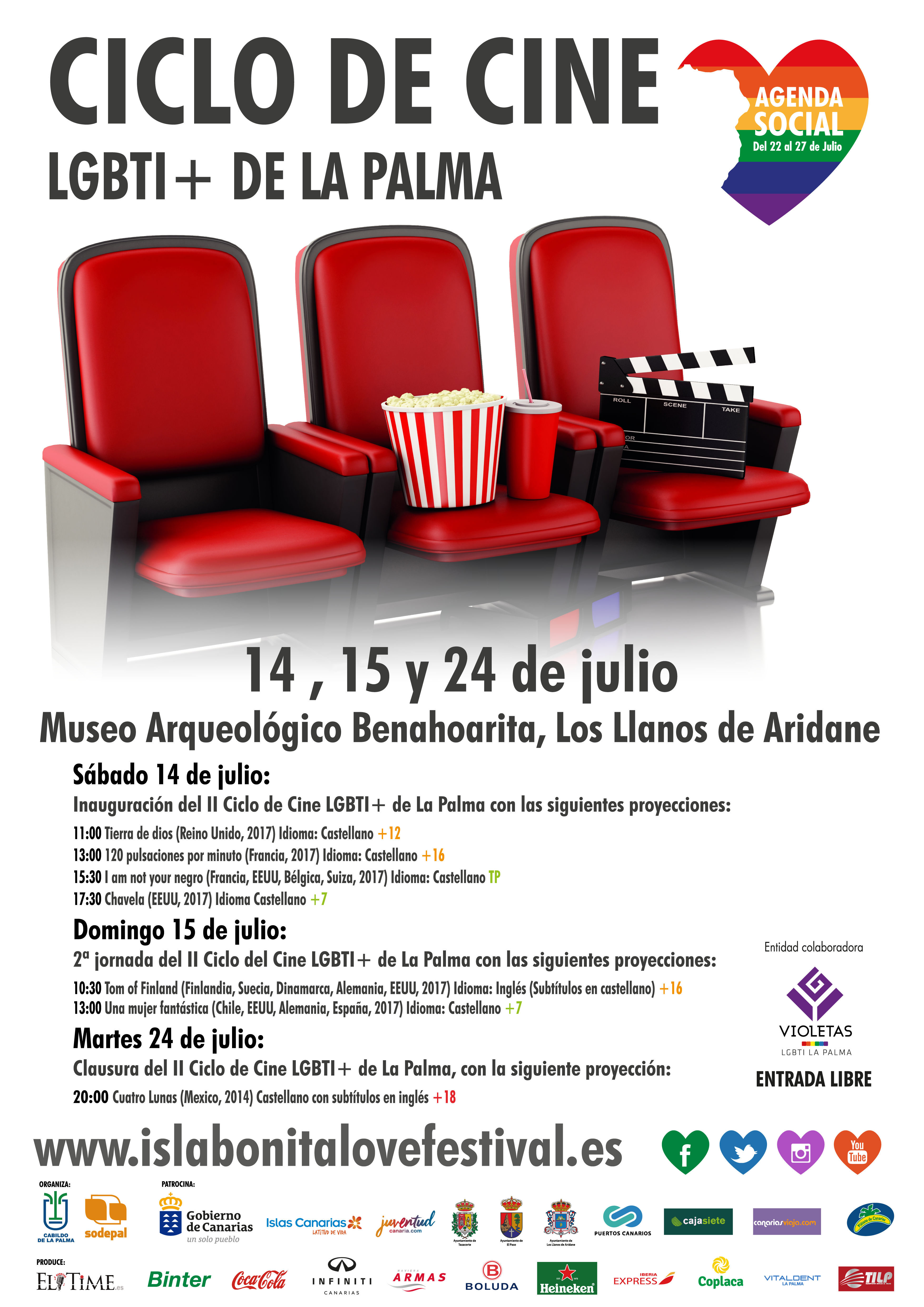 Los Llanos de Aridane, miércoles 11 de Julio de 2018.- La Agenda Social del Isla Bonita Love Festival presenta el Ciclo de Cine LGTBI+ de La Palma, una antología cinematográfica de directores de Estados Unidos, Finlandia, Francia, Bélgica, Suiza, Chile, Alemania y España, que se proyectará en el Museo Arqueológico Benahorita de Los Llanos de Aridane los días 14, 15 y 24 de Julio.